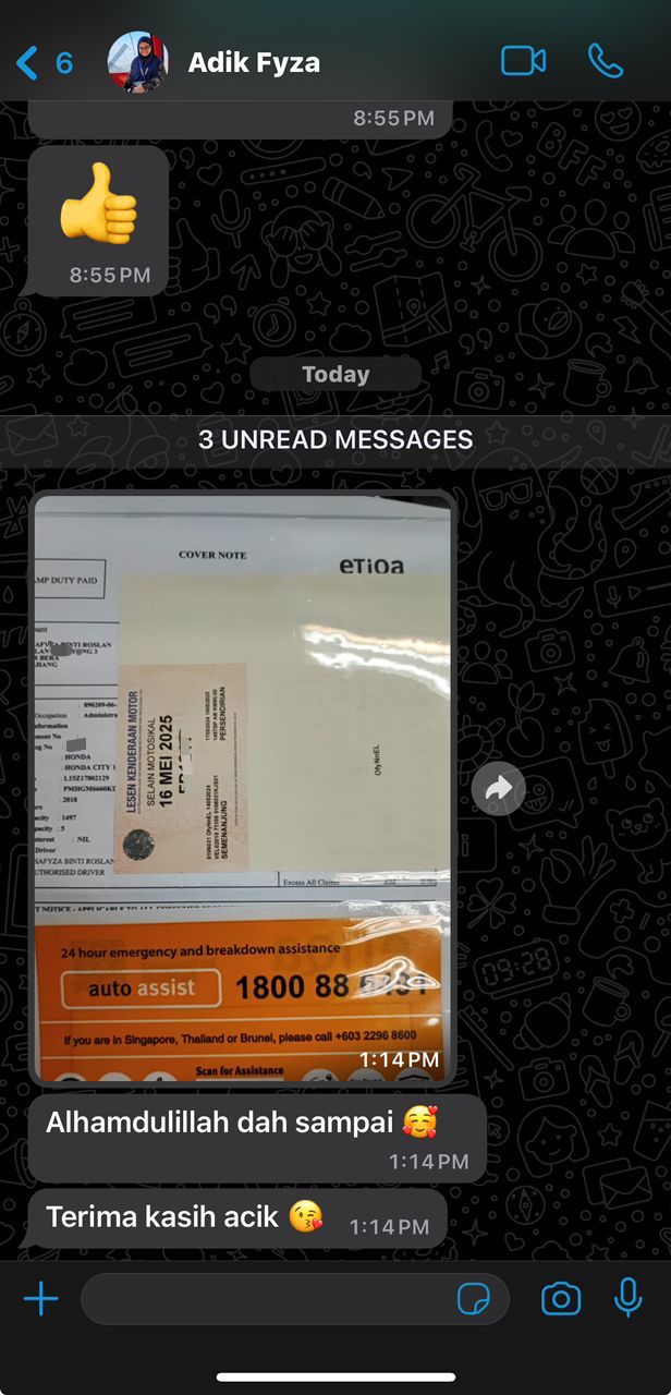 Walaupun saya jauh berlainan negeri Sabak Bernam, sy masih boleh order roadtax melalui whatsapp & Penghataran ambil masa 3hari shj melalui pos laju